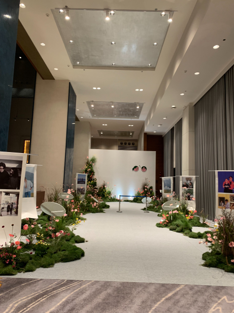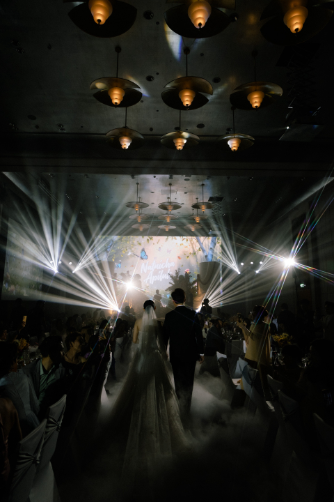 ตั้งแต่งทางเข้างานได้ทำเป็นอุโมงค์ผ้า ระหว่างทางเดินได้ฉายรูป Pre-wedding บนผ้า และมีนักไวโอลินคอยขับกล่อมดนตรีให้กับแขกที่มาร่วมงาน สัมผัสได้ถึงบรรยากาศโรแมนติกที่กำลังจะเกิดขึ้นในงานเลี้ยงฉลอง